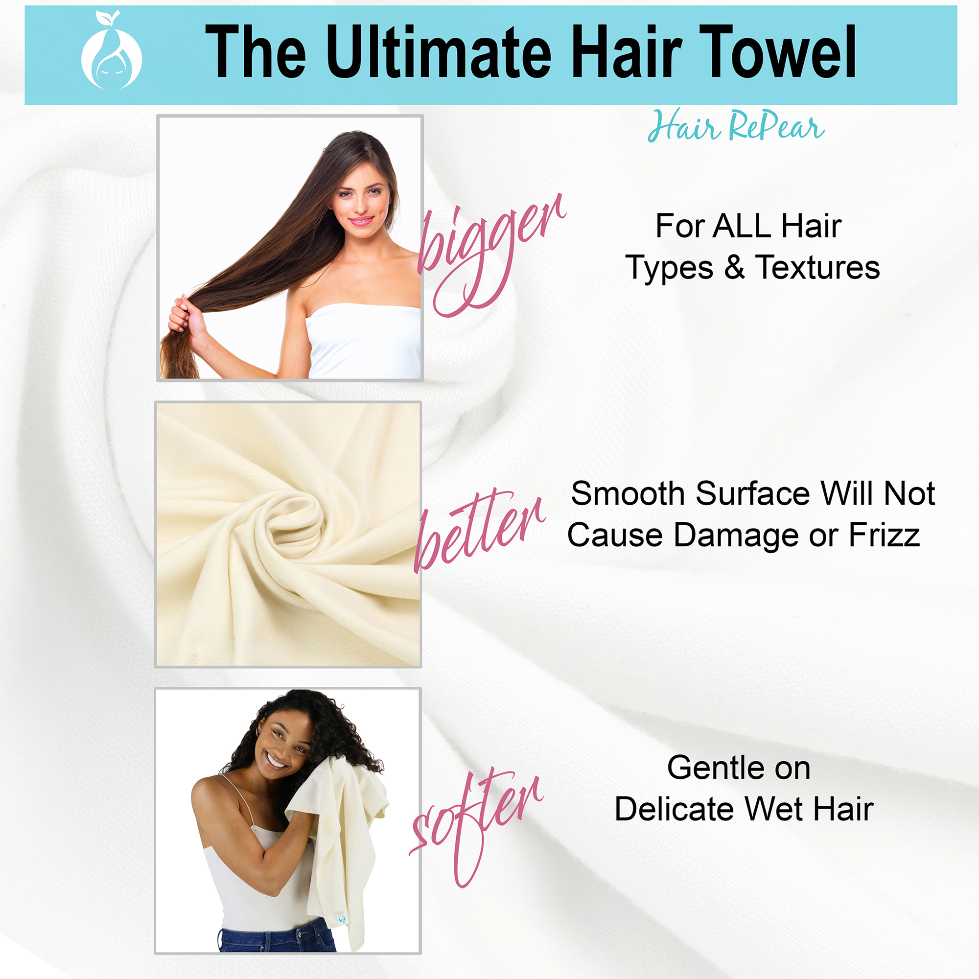 The Hair RePear towel features a completely smooth cotton surface—unlike terry cloth and microfiber towels.